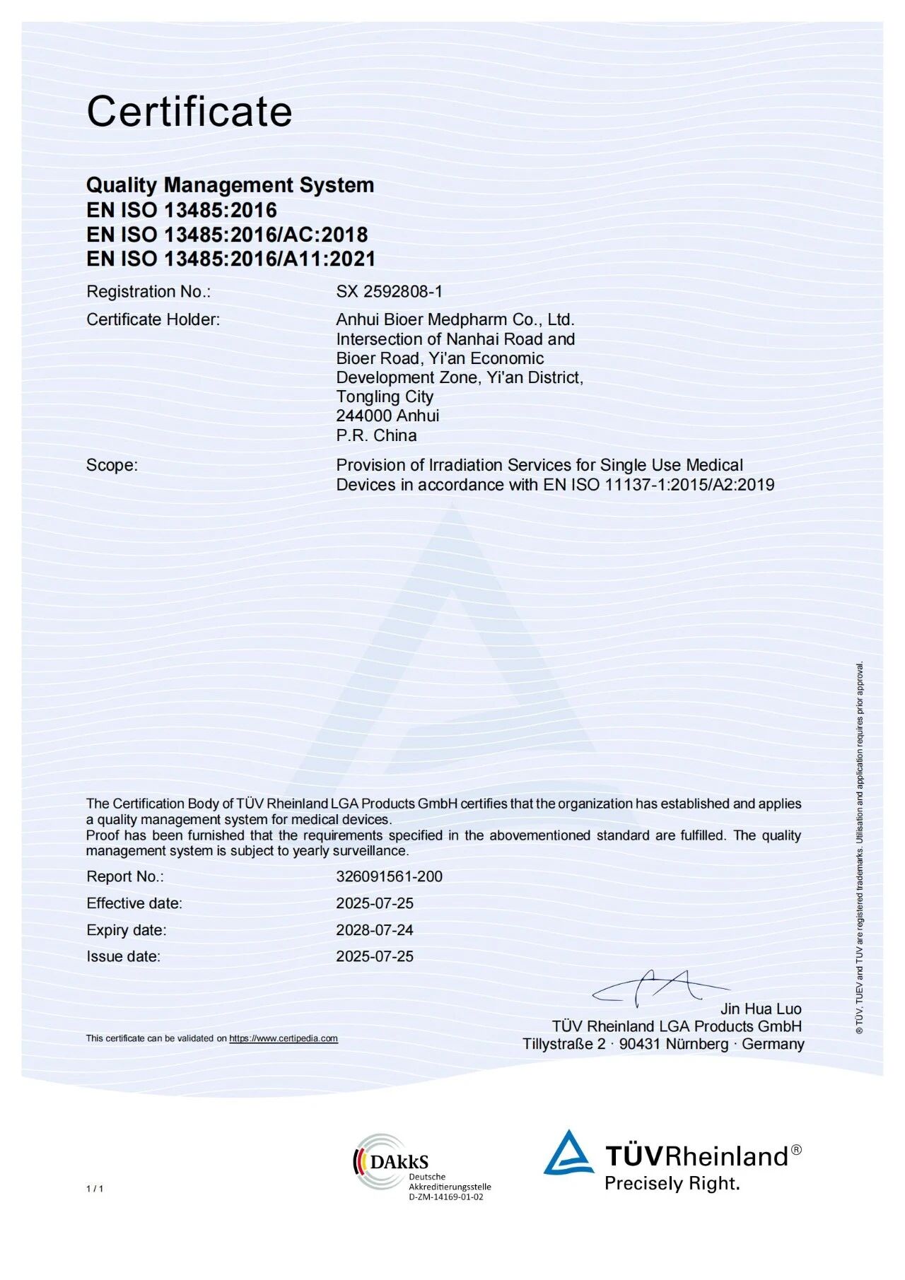 近日,安徽博日生物醫(yī)藥有限公司輻照事業(yè)部傳來重磅喜訊 —— 其質(zhì)量管理體系成功通過 EN ISO13485:2016國際質(zhì)量管理體系認證,由國際權(quán)威認證機構(gòu) TüV 萊茵(TüV Rheinland LGA Products GmbH)頒發(fā)認證證書(注冊號:SX 2592808-1),認證范圍涵蓋 “依據(jù) EN ISO11137-1:2015/A2:2019 標(biāo)準(zhǔn)提供一次性醫(yī)療器械輻照服務(wù)”。這標(biāo)志著博日輻照在醫(yī)療領(lǐng)域的質(zhì)量管理水平與國際標(biāo)準(zhǔn)全面接軌,為客戶提供更可靠、更安全的輻照服務(wù)奠定了堅實基礎(chǔ)。
