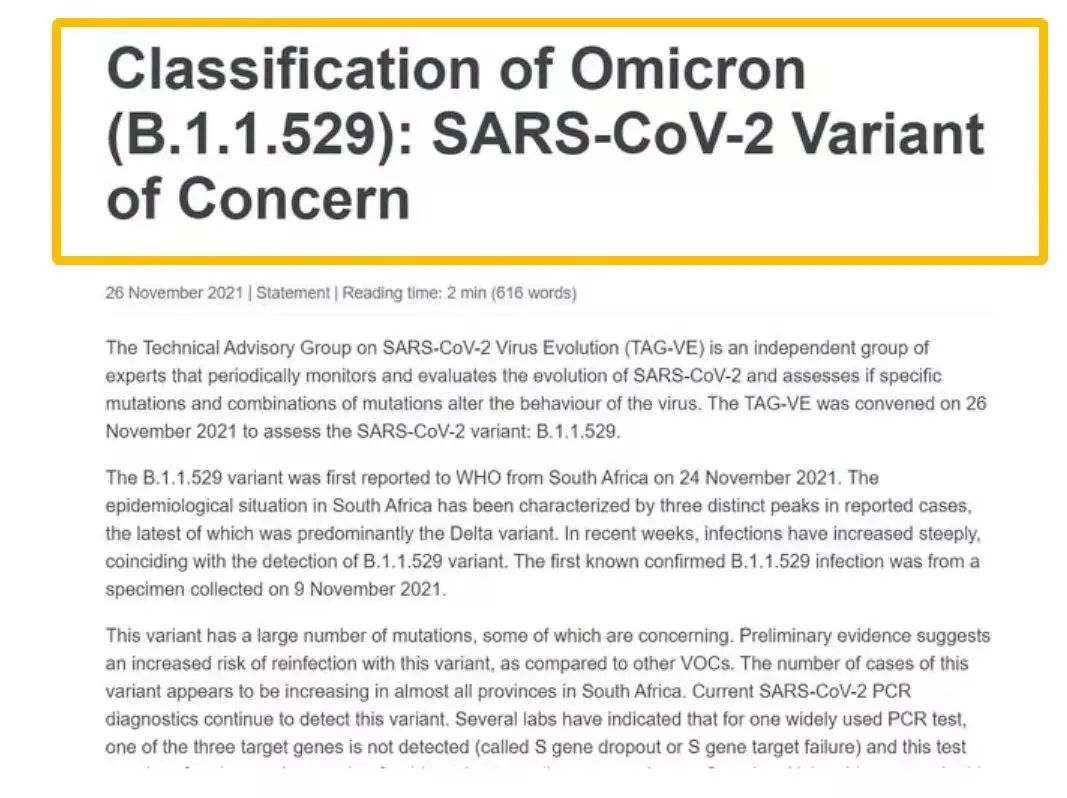 WHO發(fā)布聲明,將B.1.1.529列為“需要擔(dān)憂的變種”,命名為Omicron(以第15個(gè)希臘字母命名,中譯名“奧米克戎”)。這意味著,WHO病毒進(jìn)化技術(shù)咨詢小組的專家認(rèn)為,新變種具有更高的傳播力或致病性,或者可能降低目前診斷、疫苗和療法的有效性。