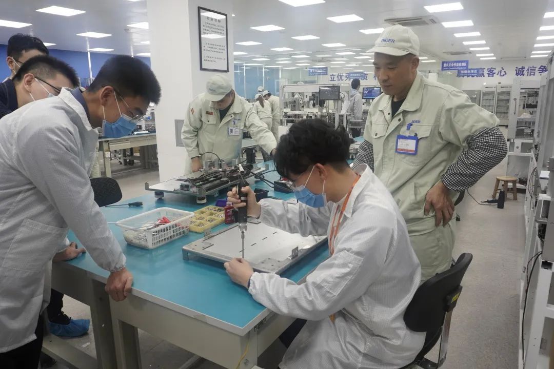 博日科技儀器產(chǎn)品管線擁有從產(chǎn)品策劃、設(shè)計、調(diào)試、驗證直至量產(chǎn)的標(biāo)準(zhǔn)化研發(fā)流程,凝聚了電氣、軟件、結(jié)構(gòu)等多方面專業(yè)人才的研發(fā)團隊,在溫度控制、光電檢測、自動化控制等方面擁有獨到的技術(shù)優(yōu)勢。此次參訪,在熒光定量PCR儀、核酸提取純化儀的組裝和調(diào)試車間,同學(xué)們系統(tǒng)性地了解了熒光定量PCR儀原理、運行過程,課堂上的知識得到了生動的展現(xiàn)。