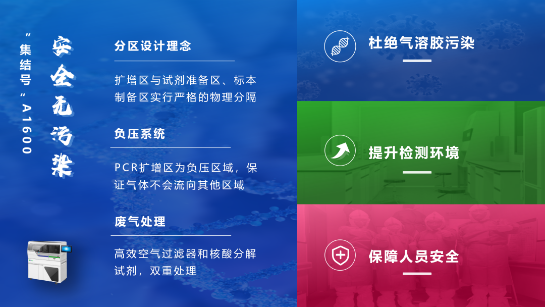 通過特殊的分區(qū)設(shè)計,封閉、負壓系統(tǒng),搭載廢氣處理單元三重設(shè)置,防止氣溶膠污染,提升檢測環(huán)境,保障實驗環(huán)境安全,結(jié)果可靠。