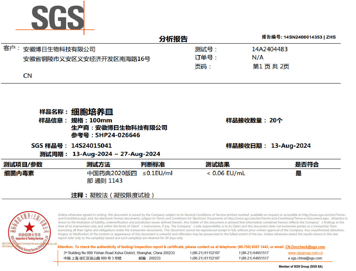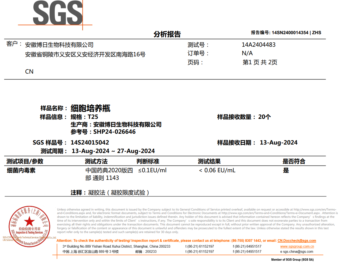 近日博日細(xì)胞培養(yǎng)系列高端耗材:細(xì)胞培養(yǎng)瓶,細(xì)胞培養(yǎng)板,細(xì)胞培養(yǎng)皿,通過權(quán)威第三方內(nèi)毒素檢測。內(nèi)毒素含量均低于0.06EU/ml,遠(yuǎn)高于國標(biāo)及同行標(biāo)準(zhǔn),博日生物以嚴(yán)苛技術(shù)標(biāo)準(zhǔn),為細(xì)胞實(shí)驗(yàn)保駕護(hù)航!(參見文末第三方檢測證書)