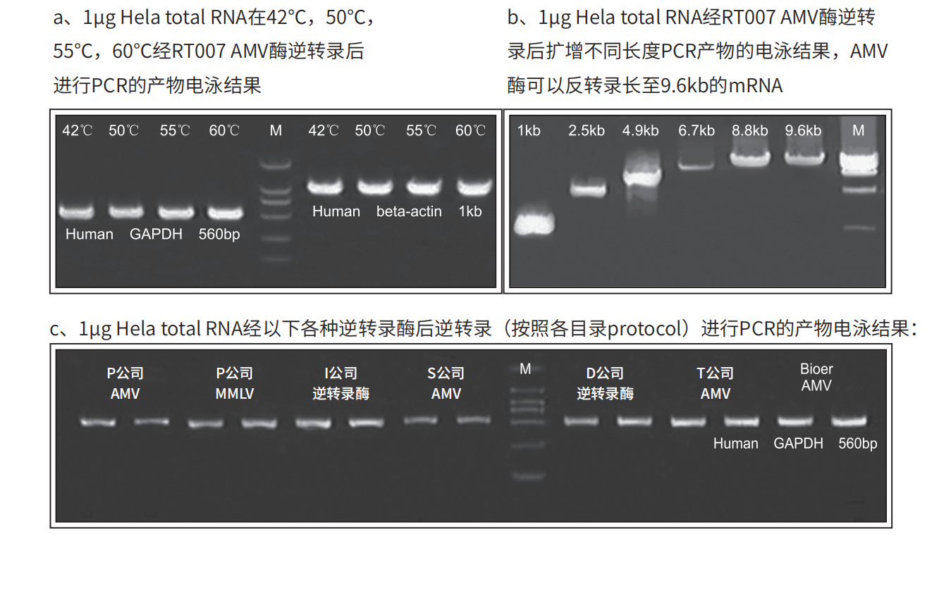 RT007 AMV逆轉錄酶分離自禽類成髓細胞瘤病毒(AMV),其方法由Houts等人的方法改進?來。分離得到的酶是分子量為157KD的αβ全酶。本酶經高度純化,完全無核酸污染。本酶可用于cDNA合成,也可用于RNA和DNA的雙脫氧測序。RT007 AMV逆轉錄酶以總RNA或polyA+RNA為模板,具有以RNA為模板的DNA聚合酶活性,DNA為模板的DNA聚合酶活性和RNaseH酶活性,最適反應溫度在42?55℃,最高可達60℃,如果使用焦磷酸鈉,最適溫度為37~41℃。專利配方的RT反應緩沖液根據(jù)不同用途可以作為5x或10x反應液使用(詳見標準使用方法),同時可抑制RNase H酶活性。按照標準使用方法可以得到?至10?12kb cDNA。RT007 AMV逆轉錄酶比普通AMV逆轉錄酶和MMLV逆轉錄酶能耐受更高的溫度和合成更長的cDNA。