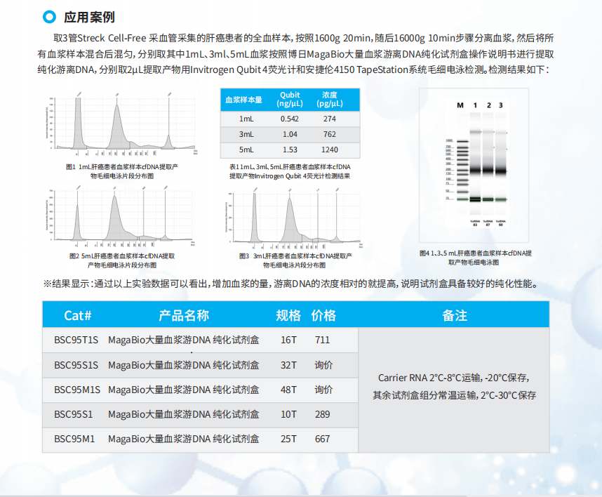 熒光定量PCR、基因測(cè)序(例如無(wú)創(chuàng)產(chǎn)前基因檢測(cè)、腫瘤檢測(cè))、文庫(kù)構(gòu)建等。試劑盒采用獨(dú)特的裂解液配方和磁珠分離純化技