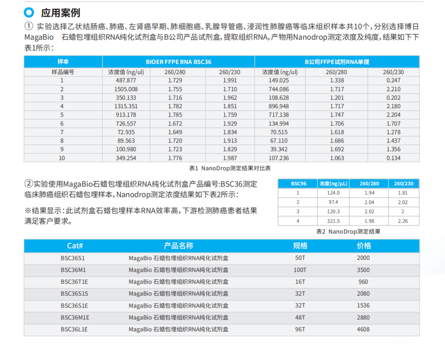 MagaBio 石蠟包埋組織RNA純化試劑盒適用于從石蠟包埋組織或福爾馬林固定組織中提取高質(zhì)量的RNA,采用安全無毒的脫蠟溶液,特殊的裂解液配方,快速釋放樣本中的RNA,通過高效的結(jié)合純化系統(tǒng),提取得到完整性好高純度的RNA。