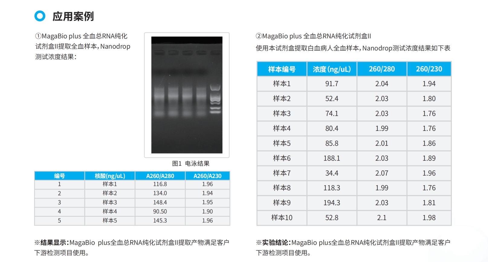 本試劑盒是適用于從全血樣本中提取高純度的RNA。試劑盒操作簡單,全血樣本混勻后可直接加入到試劑板中配套自動化儀器進(jìn)行提取,試劑盒采用DNase消化體系去除DNA,保證了最后提取產(chǎn)物RNA的純凈。本試劑盒具有穩(wěn)定性好、操作簡單、靈敏度高等特點,純化后的核酸可直接用于下游如測序,qPCR等檢測。