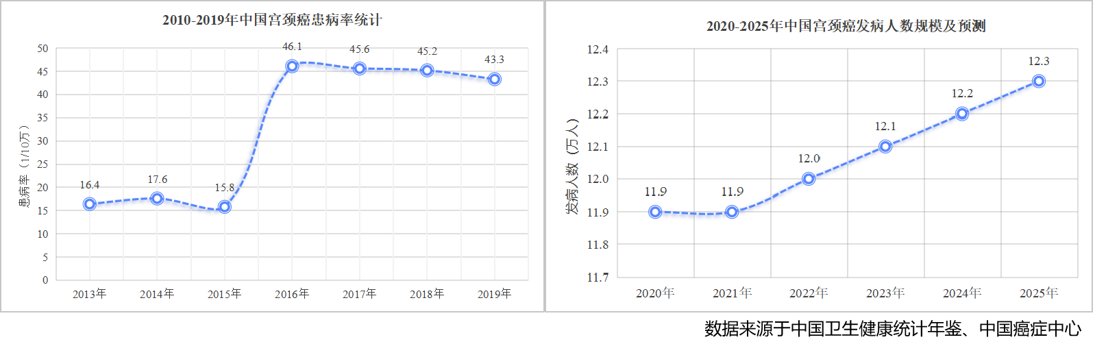 目前,宮頸癌是女性第二大常見癌癥,且在中國女性生殖系統(tǒng)惡性腫瘤中發(fā)病率和死亡率均居首位。據(jù)中國衛(wèi)生健康統(tǒng)計年鑒和中國癌癥中心報告,近15年中國宮頸癌發(fā)病人數(shù)在持續(xù)增加,預計到2025年宮頸癌發(fā)病人數(shù)約為12.3萬人,這意味著中國每天每小時約有14名女性確診宮頸癌。