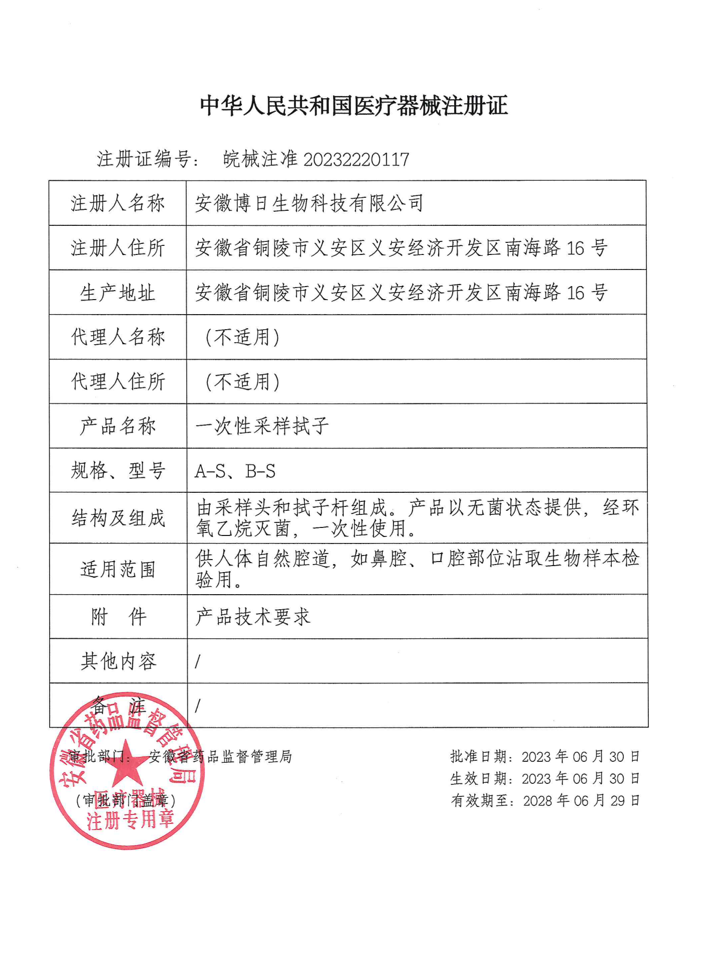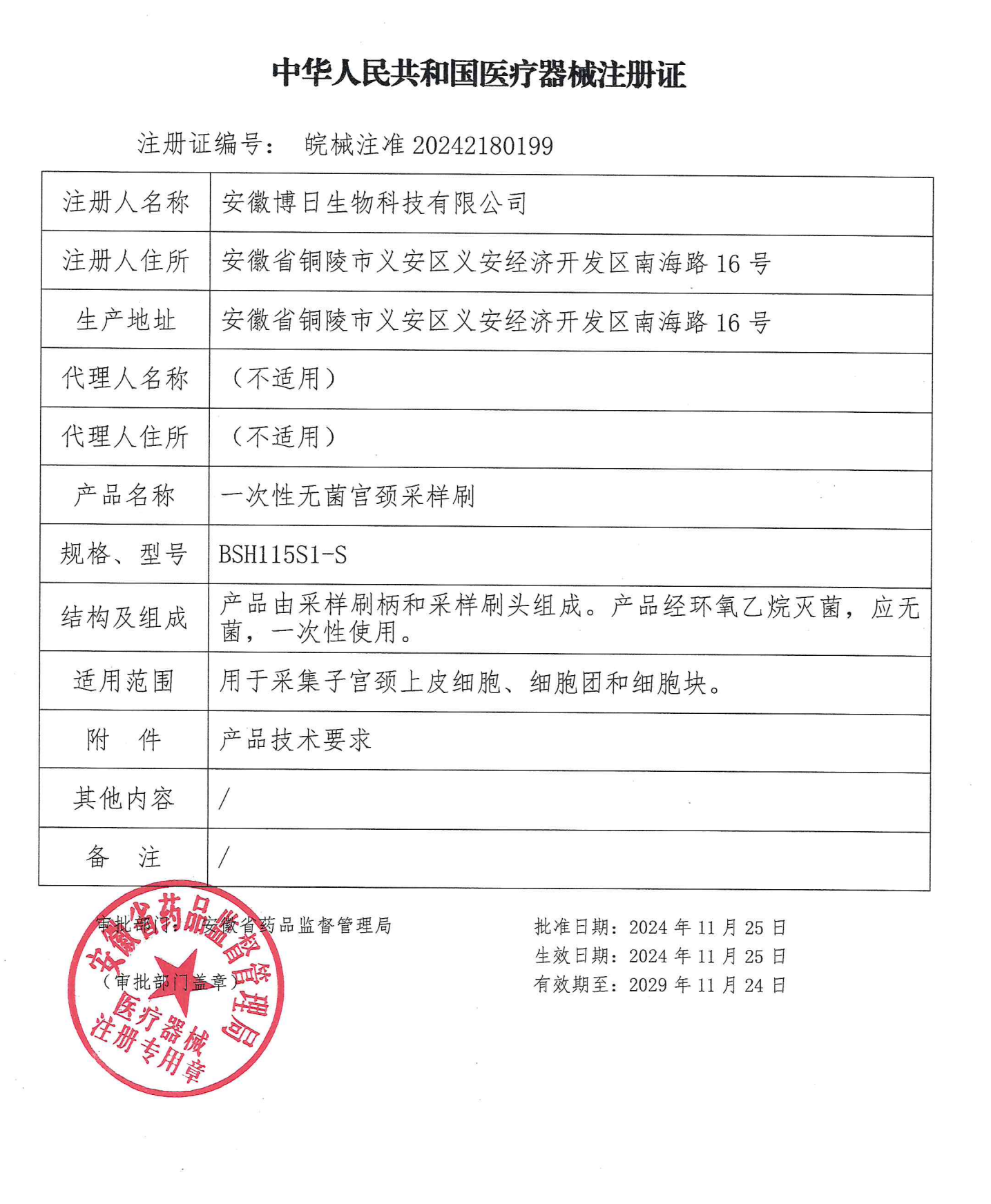 安徽博日生物自主研發(fā)的一次性無菌宮頸采樣刷喜獲NMPA(中國國家藥品監(jiān)督管理局,簡稱NMPA)注冊證,這也是繼一次性采樣拭子獲得NMPA注冊證、一次性無菌宮頸采樣刷和一次性采樣拭子斬獲歐盟CE認證后的又一重大突破!