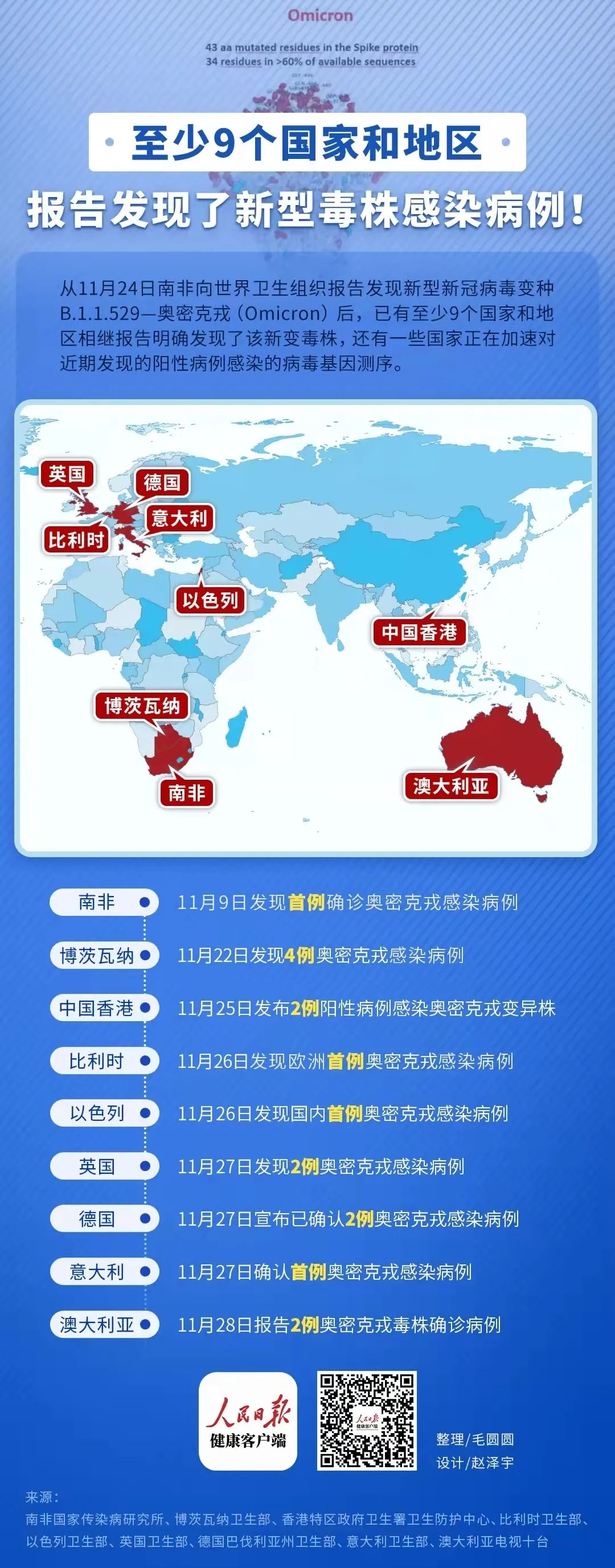 截至目前,5天內(nèi)已有至少博茨瓦納、比利時(shí)、以色列、英國(guó)、德國(guó)、意大利、中國(guó)香港、澳大利亞等9個(gè)國(guó)家和地區(qū)報(bào)告發(fā)現(xiàn)了該新型變異毒株。此外,荷蘭、捷克也疑似出現(xiàn)了此變異毒株的蹤跡,正在做進(jìn)一步的病毒基因測(cè)序。