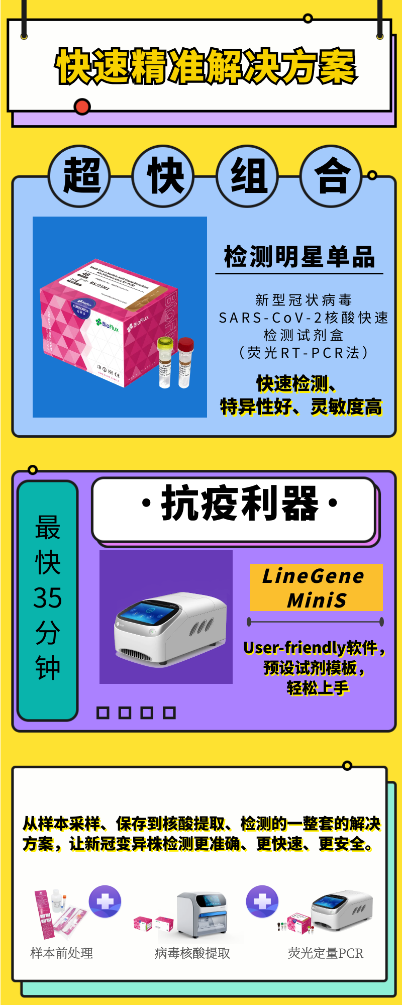 面對(duì)肆虐的海外疫情,博日科技順勢(shì)推出快速精準(zhǔn)解決方案:LineGene MiniS搭配博日新型冠狀病毒SARS-CoV-2核酸快速檢測(cè)試劑盒(熒光RT-PCR法),最快檢測(cè)時(shí)間可達(dá)35min。