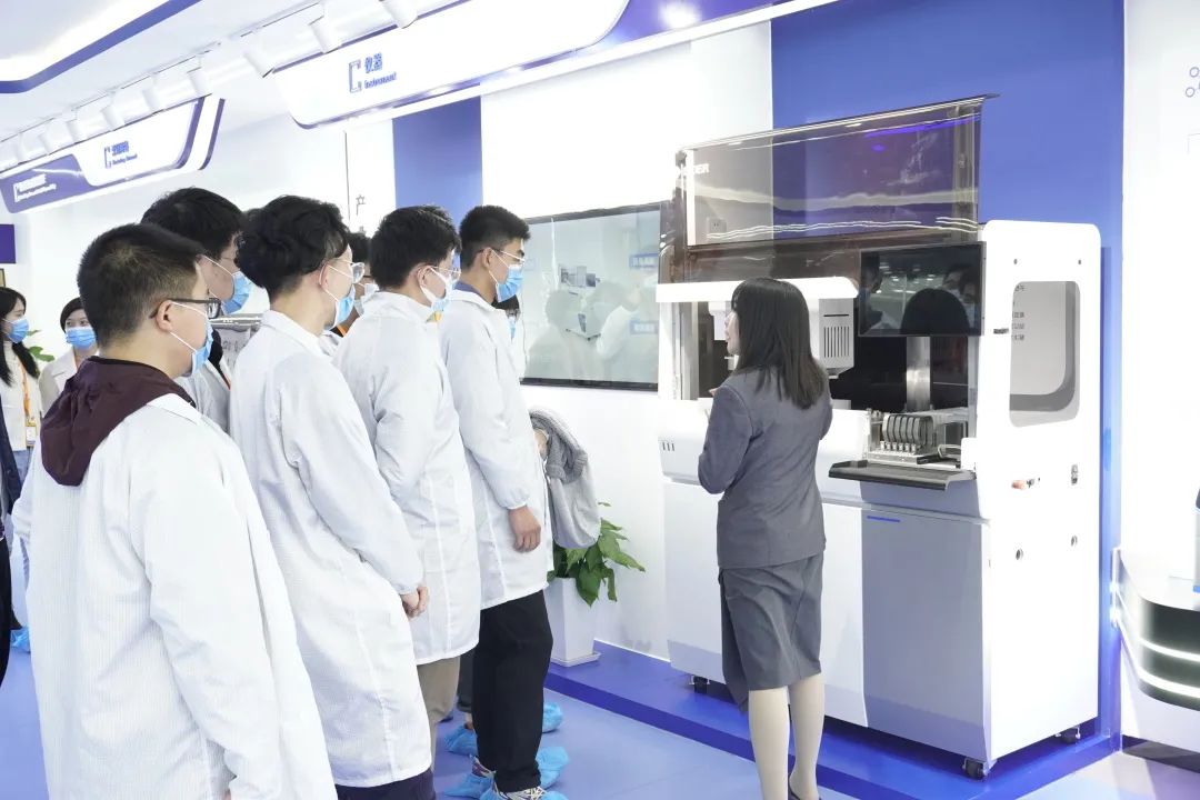 博日科技儀器產(chǎn)品管線擁有從產(chǎn)品策劃、設(shè)計、調(diào)試、驗證直至量產(chǎn)的標(biāo)準(zhǔn)化研發(fā)流程,凝聚了電氣、軟件、結(jié)構(gòu)等多方面專業(yè)人才的研發(fā)團隊,在溫度控制、光電檢測、自動化控制等方面擁有獨到的技術(shù)優(yōu)勢。此次參訪,在熒光定量PCR儀、核酸提取純化儀的組裝和調(diào)試車間,同學(xué)們系統(tǒng)性地了解了熒光定量PCR儀原理、運行過程,課堂上的知識得到了生動的展現(xiàn)。