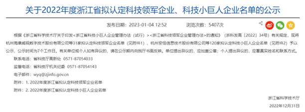 本次評選根據(jù)《浙江省科學技術廳關于印發(fā)<浙江省科技小巨人企業(yè)管理辦法(試行)><浙江省科技領軍企業(yè)管理辦法>的通知》(浙科發(fā)高〔2022〕34號)有關規(guī)定,由浙江省科學技術廳于近日公布認定結果。