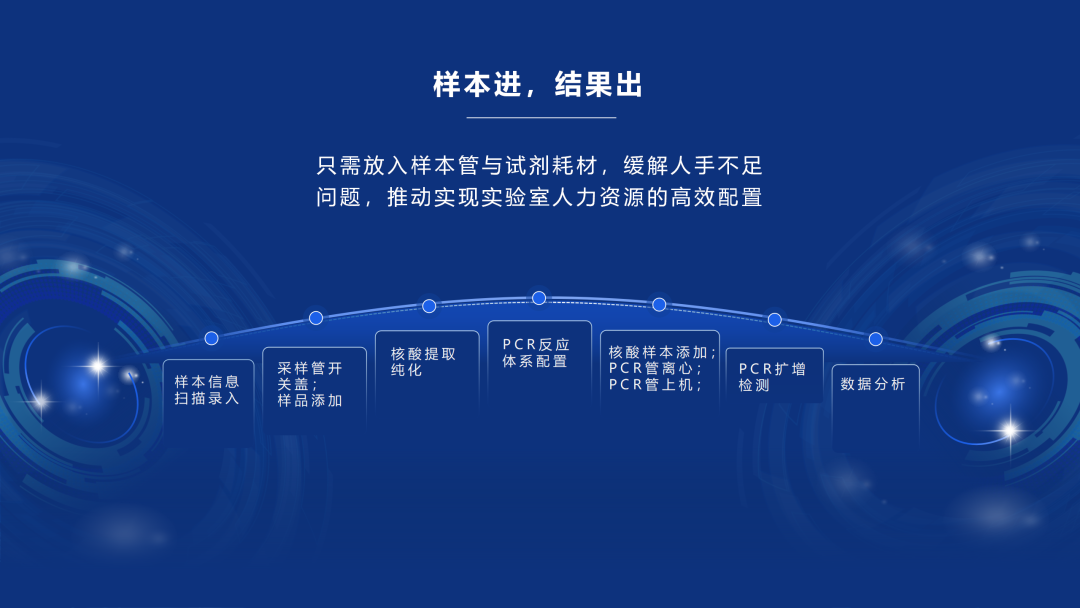 全自動核酸提純及實時熒光PCR分析系統(tǒng)可實現(xiàn)全程自動化,涵蓋“樣本前處理+核酸提取+熒光定量PCR”整套實驗流程。