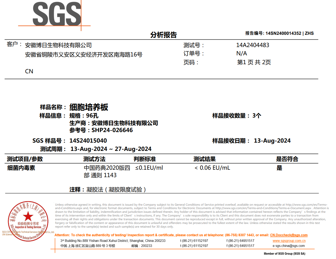 近日博日細(xì)胞培養(yǎng)系列高端耗材:細(xì)胞培養(yǎng)瓶,細(xì)胞培養(yǎng)板,細(xì)胞培養(yǎng)皿,通過權(quán)威第三方內(nèi)毒素檢測。內(nèi)毒素含量均低于0.06EU/ml,遠(yuǎn)高于國標(biāo)及同行標(biāo)準(zhǔn),博日生物以嚴(yán)苛技術(shù)標(biāo)準(zhǔn),為細(xì)胞實(shí)驗(yàn)保駕護(hù)航!(參見文末第三方檢測證書)