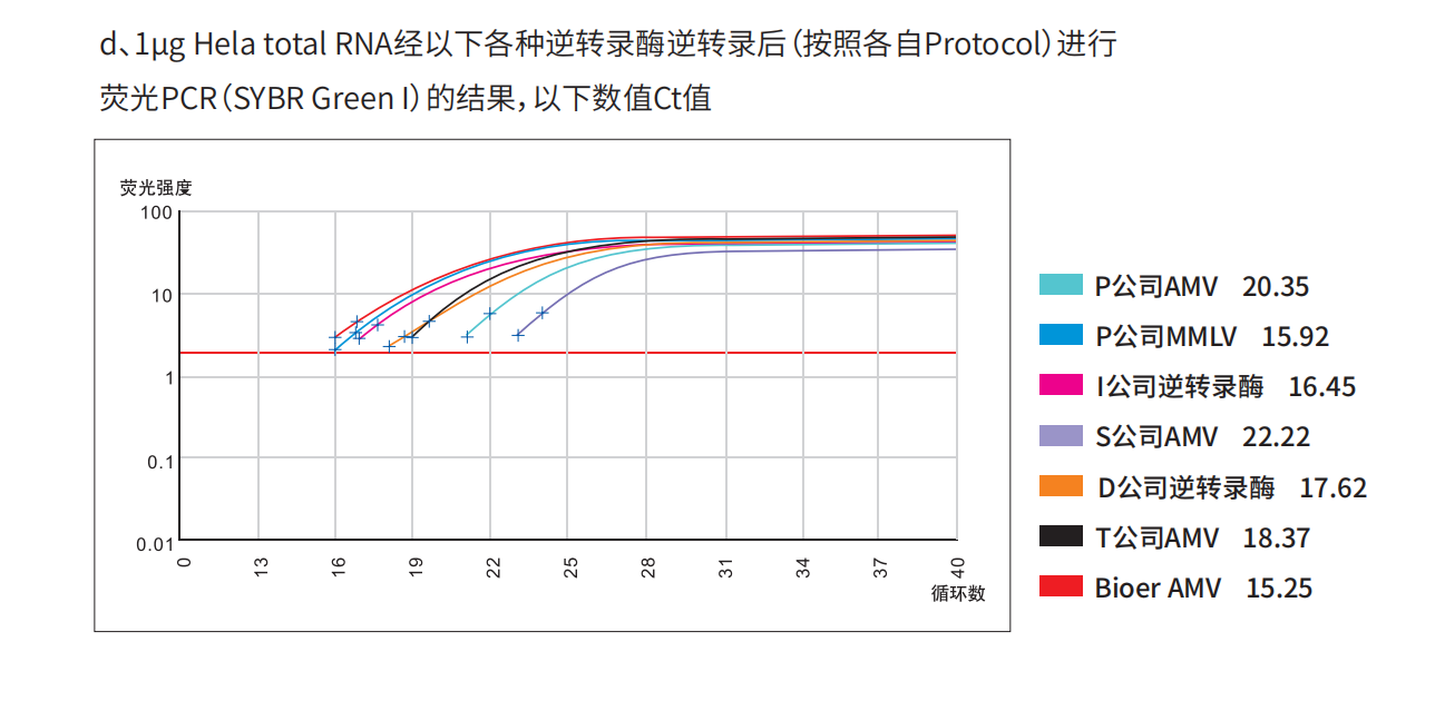 RT007 AMV逆轉錄酶分離自禽類成髓細胞瘤病毒(AMV),其方法由Houts等人的方法改進?來。分離得到的酶是分子量為157KD的αβ全酶。本酶經高度純化,完全無核酸污染。本酶可用于cDNA合成,也可用于RNA和DNA的雙脫氧測序。RT007 AMV逆轉錄酶以總RNA或polyA+RNA為模板,具有以RNA為模板的DNA聚合酶活性,DNA為模板的DNA聚合酶活性和RNaseH酶活性,最適反應溫度在42?55℃,最高可達60℃,如果使用焦磷酸鈉,最適溫度為37~41℃。專利配方的RT反應緩沖液根據(jù)不同用途可以作為5x或10x反應液使用(詳見標準使用方法),同時可抑制RNase H酶活性。按照標準使用方法可以得到?至10?12kb cDNA。RT007 AMV逆轉錄酶比普通AMV逆轉錄酶和MMLV逆轉錄酶能耐受更高的溫度和合成更長的cDNA。