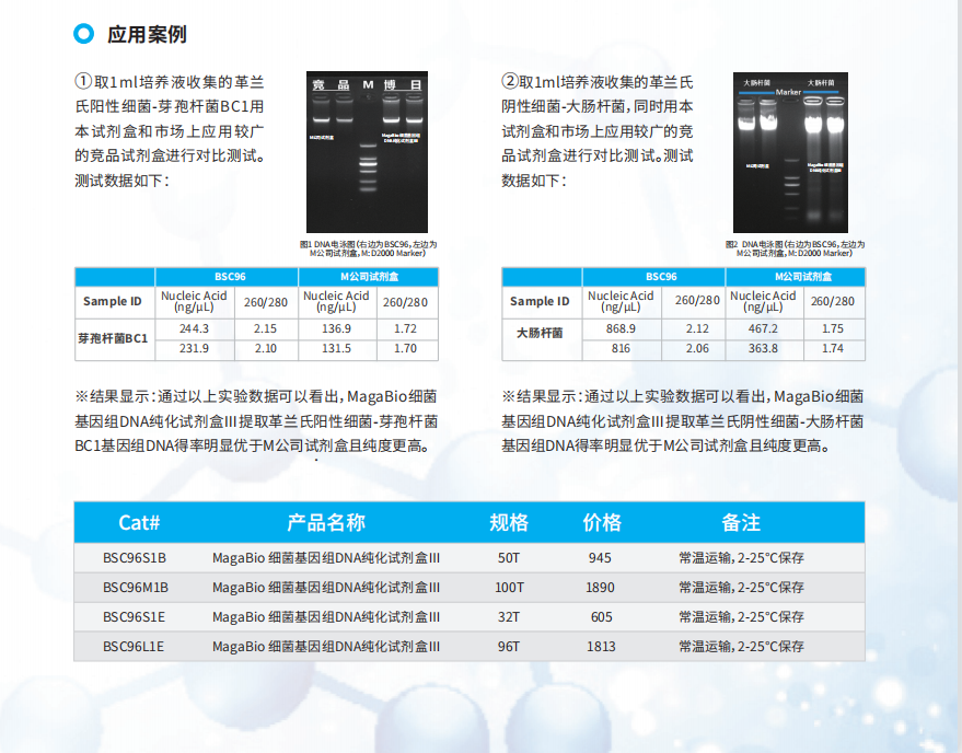 本試劑盒適用于從各種細菌樣本中提取基因組DNA片段,純化的DNA產(chǎn)量高、質(zhì)量好,最大限度去除蛋白、脂類及其他抑