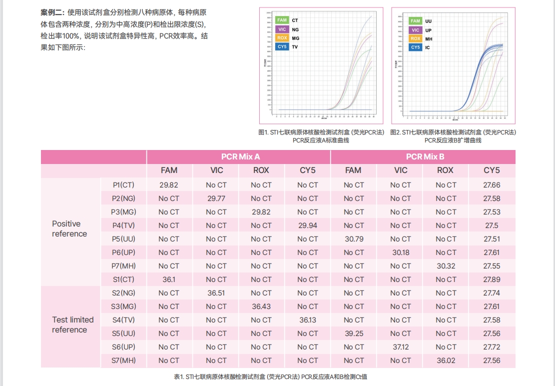 本試劑盒參考七種病原體基因組中相對(duì)保守區(qū)為靶區(qū)域,設(shè)計(jì)合成特異性引物及熒光基團(tuán)標(biāo)記的特異性熒光探針,同普通PCR相比該方法具有自動(dòng)化程度高、快速、敏感、特異性高等特點(diǎn)。本試劑盒通過(guò)對(duì)反應(yīng)緩沖體系和熱啟動(dòng)DNA聚合酶的優(yōu)化,生產(chǎn)全預(yù)混反應(yīng)液,節(jié)省用戶(hù)配液的操作步驟。同時(shí),在提取過(guò)程中引入人RnaseP基因作為非競(jìng)爭(zhēng)性?xún)?nèi)參質(zhì)控整個(gè)提取和檢測(cè)過(guò)程,避免了假陰性結(jié)果。