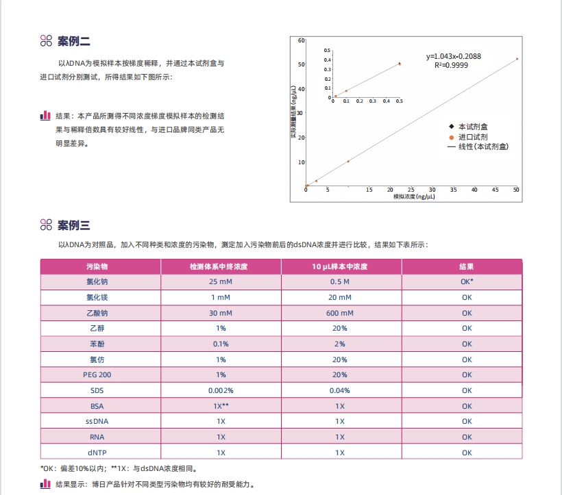 本試劑盒是博日全新開發(fā)的一種便捷、靈敏、精確的雙鏈DNA(dsDNA)熒光定量檢測(cè)試劑盒,包含工作液及dsDNA標(biāo)準(zhǔn)品。試劑盒對(duì)dsDNA選擇性高,可以對(duì)濃度范圍在10 pg/μL到100 ng/μL之間的樣品進(jìn)行精確定量,并且對(duì)一些常規(guī)的污染物,如鹽、游離核苷酸、溶劑、去污劑和蛋白質(zhì)等都有較好的耐受性。